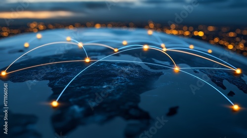 The watermark will not be included on Wall mural.: Globe with many lines connecting it, with the lines glowing in the dark - the globe is surrounded by