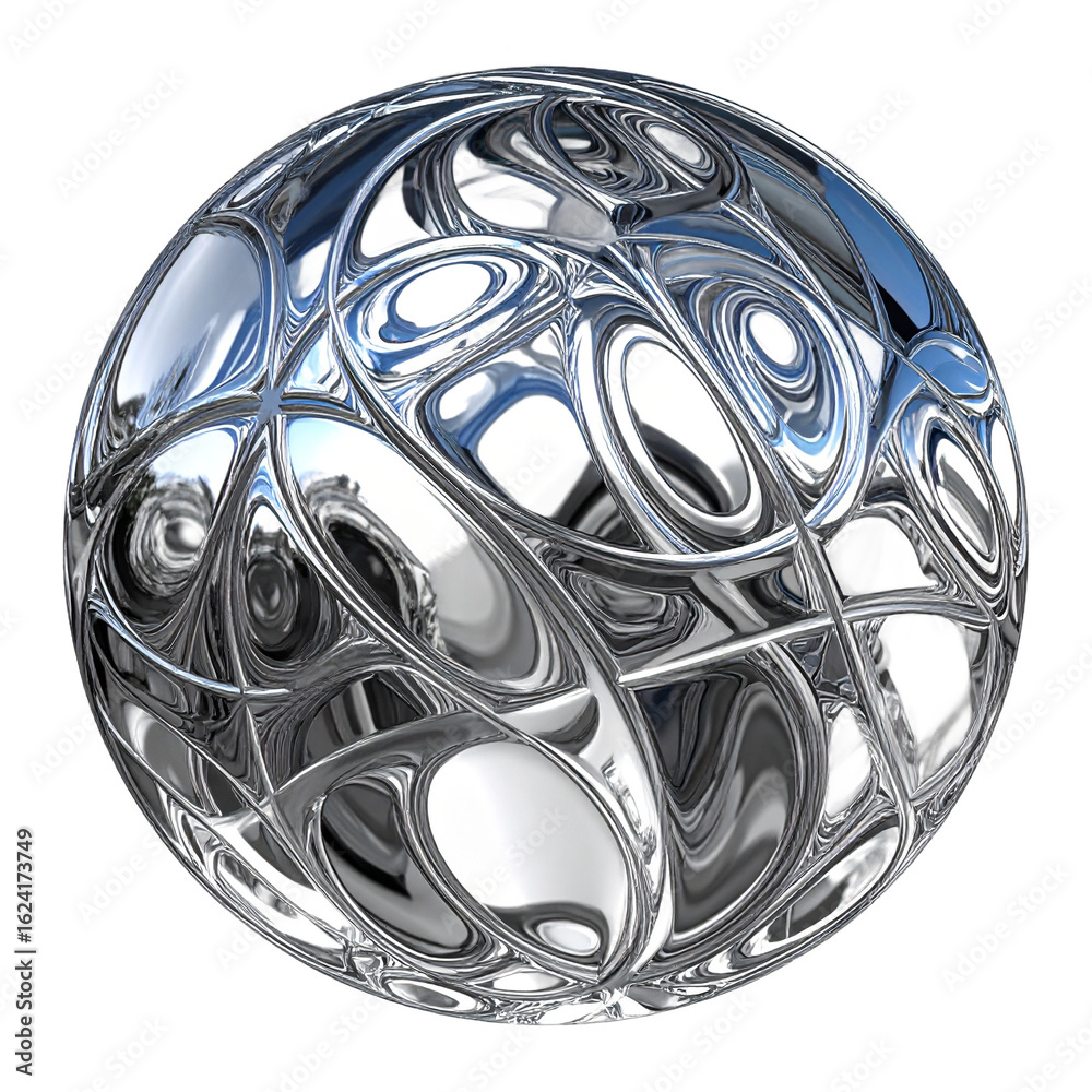 Glossy chrome sphere with reflective surface and intricate abstract design against transparent backgWall mural