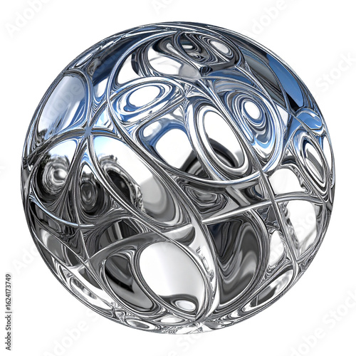 Wall mural : Glossy chrome sphere with reflective surface and intricate abstract design against transparent backg