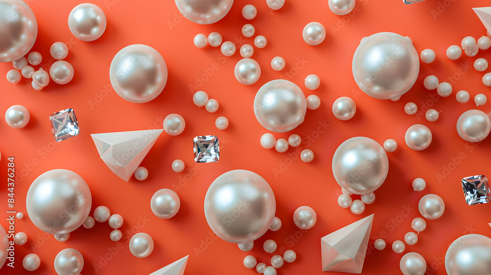 The watermark will not be included on Wall mural.: Glossy pearls and triangular buttons scattered on a coral background