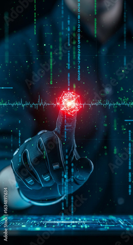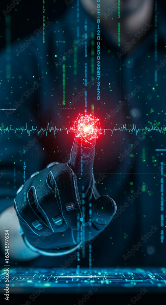 The watermark will not be included on Wall mural.: Gloved hand interacts with glowing red network node, digital data streams in background, representin