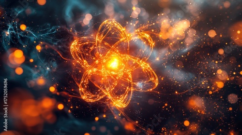 Wall mural : Glowing atom model with energy trails and sparkling particles in space