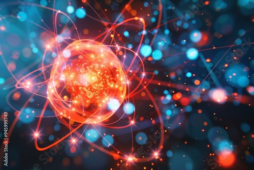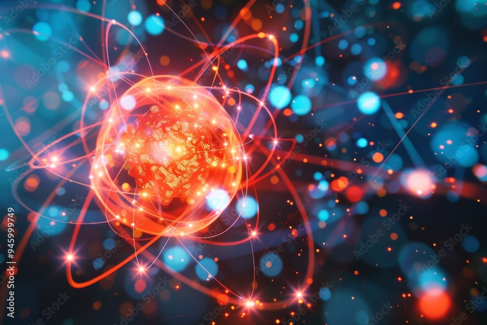 Wall mural : Glowing atomic structure with abstract orbits and particles - modern artistic science concept