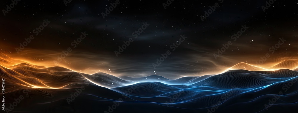 Wall mural glowing blue and orange lights form a digital wave pattern made of dots, creating an abstract backgr - Wall murals Wall mural glowing blue and orange lights form a digital wave pattern made of dots, creating an abstract backgr - Wall murals