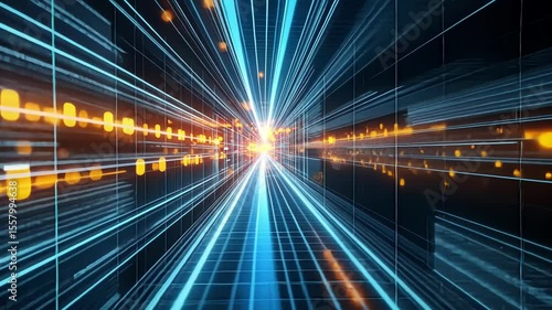 Wall mural : Glowing blue and orange lines of code are streaming through a digital cyberspace tunnel, creating a