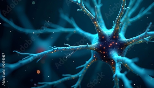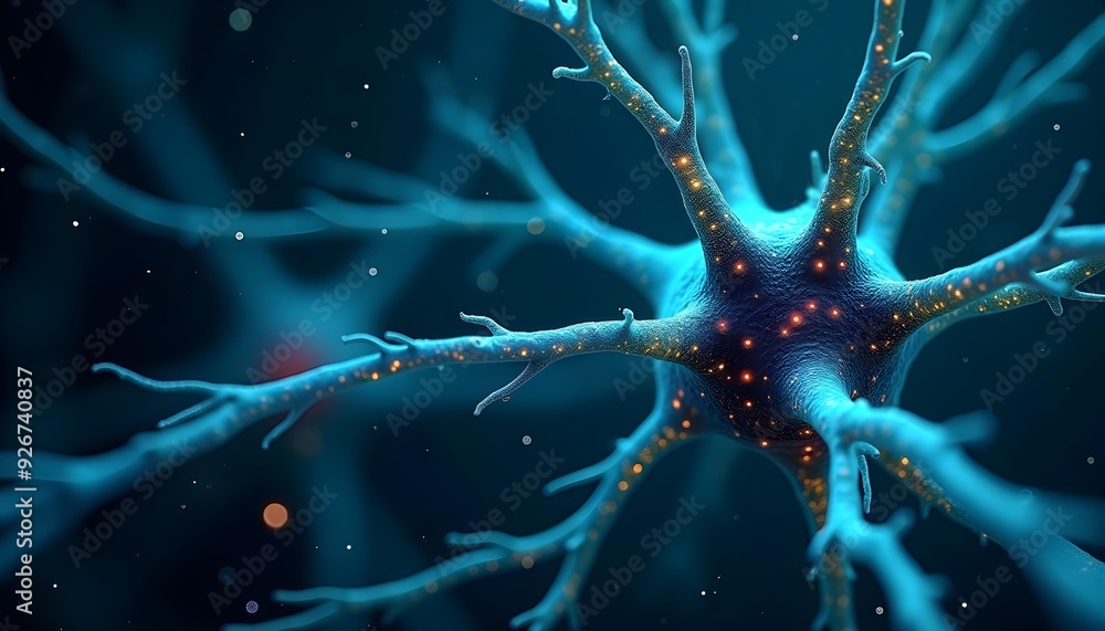 The watermark will not be included on Wall mural.: Glowing blue and red neural network or neuron cells, with intricate branching structures and sparks