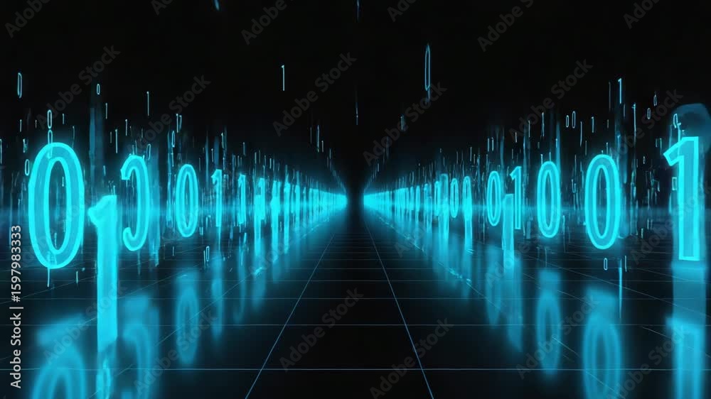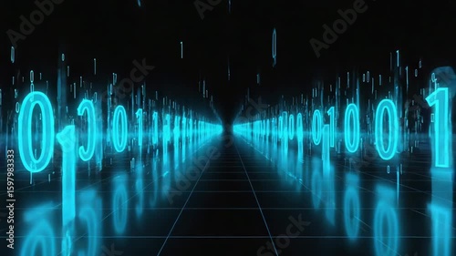 The watermark will not be included on Wall mural.: Glowing blue binary numbers form a futuristic corridor, creating a technological path in a dark cybe
