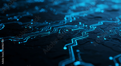 Wall mural glowing blue circuit pathways on a dark motherboard. a futuristic technology background representing - Wall murals Wall mural glowing blue circuit pathways on a dark motherboard. a futuristic technology background representing - Wall murals