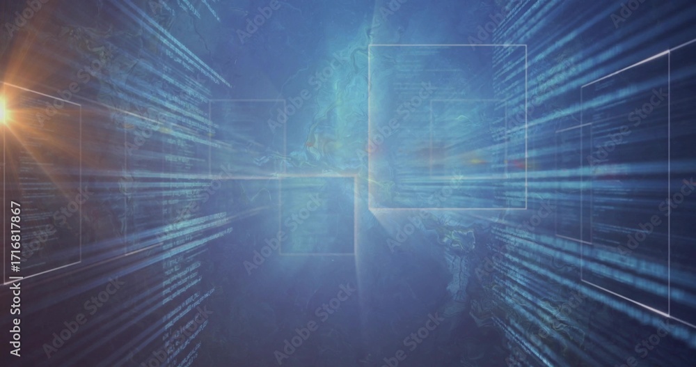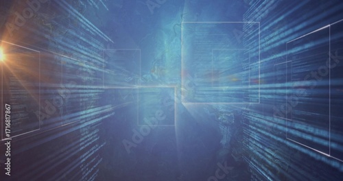 Wall mural glowing central translucent panel floating in digital space, with code streams and light flare