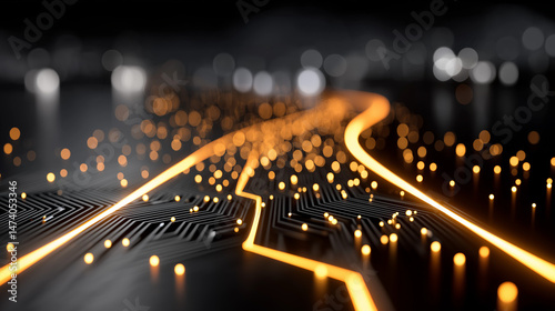 Wall mural : Glowing circuit board pathways: abstract image of a circuit board with glowing orange pathways, sugg