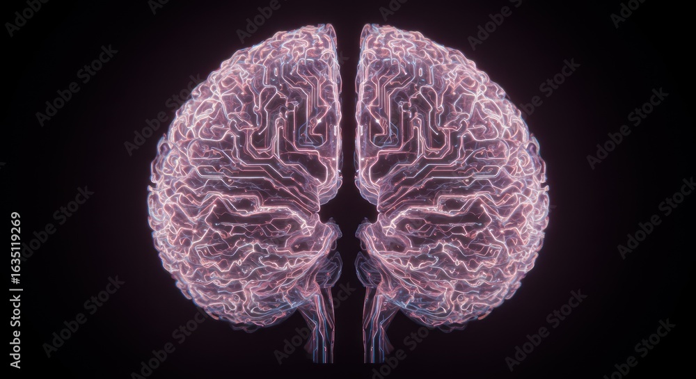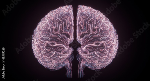 Wall mural : Glowing circuit brain: digital neural network on black background