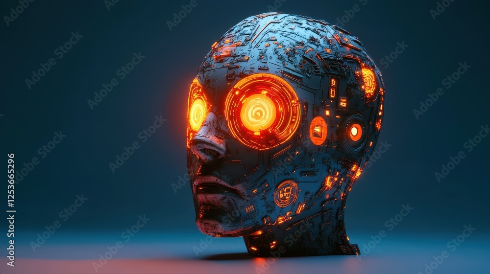 Wall mural glowing circuit head on blue backdrop. 3d rendering.
