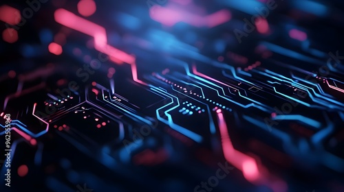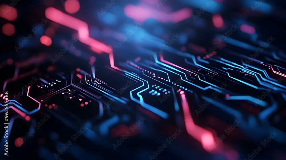 Wall mural : Glowing circuitry patterns symbolizing technology and innovation in a minimalist cyberpunk inspired