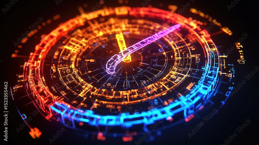 Wall mural glowing circular abstract tech display with clock hands on a dark background, with orange and blue c - Wall murals Wall mural glowing circular abstract tech display with clock hands on a dark background, with orange and blue c - Wall murals