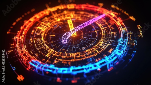 The watermark will not be included on Wall mural.: Glowing circular abstract tech display with clock hands on a dark background, with orange and blue c