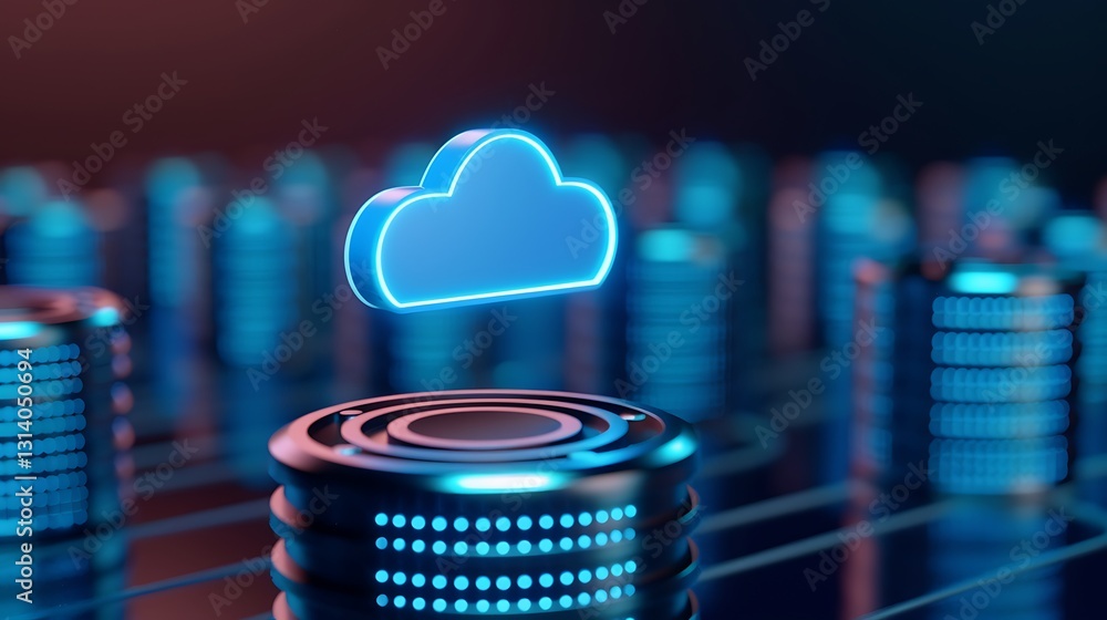 Wall mural : Glowing cloud icon above data storage cylinders in digital network environment with futuristic blue