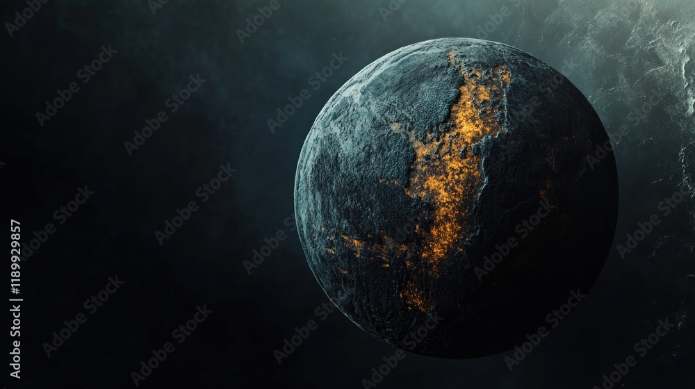 The watermark will not be included on Wall mural.: Glowing core of a desolate planet in the dark vastness of space: a digital art representation