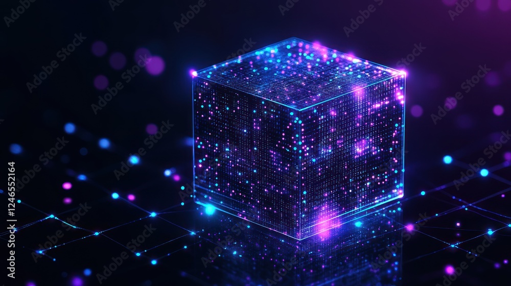 The watermark will not be included on Wall mural.: Glowing cube with digital data streams and connections -