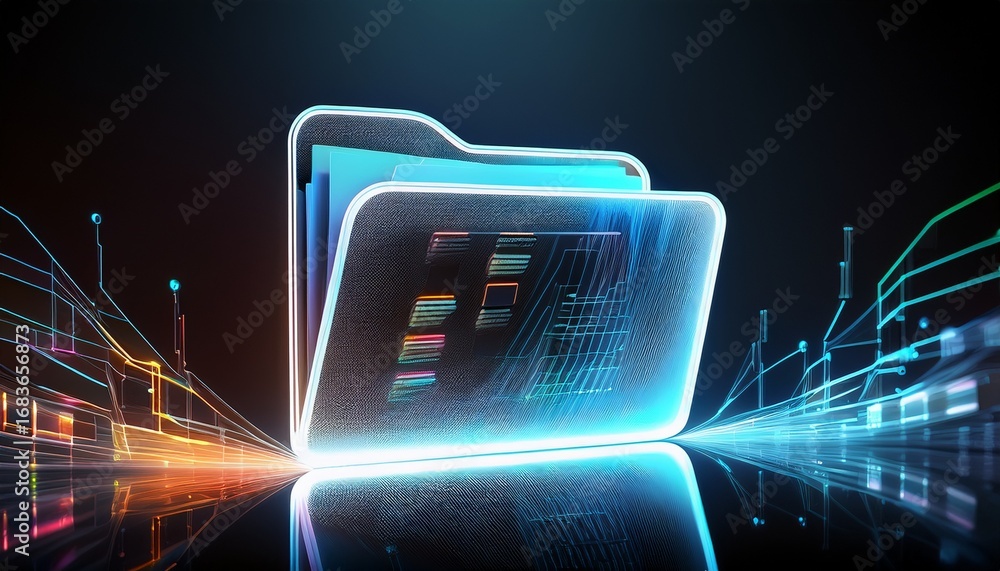Wall mural glowing digital folder with illuminated files inside on dark reflective surface showing futuristic d - Wall murals Wall mural glowing digital folder with illuminated files inside on dark reflective surface showing futuristic d - Wall murals