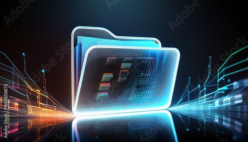 Wall mural : Glowing digital folder with illuminated files inside on dark reflective surface showing futuristic d