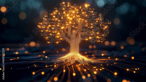 Wall mural : Glowing digital tree with roots and bokeh lights -