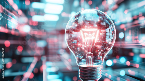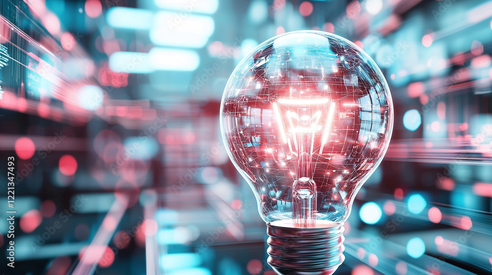 Wall mural : Glowing glass lightbulb with digital data in vibrant abstract background