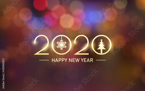 Wall mural : Glowing golden happy new year 2020 with bokeh and lens flare pattern in vintage orange color backgro