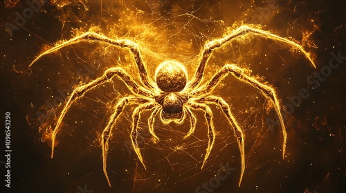 The watermark will not be included on Wall mural.: Glowing golden spider weaving an intricate web set against a dark moody backdrop