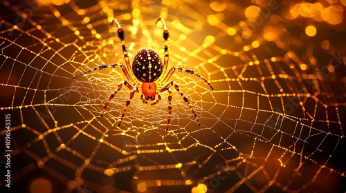 The watermark will not be included on Wall mural.: Glowing golden spider weaving an intricate web set against a dark moody backdrop