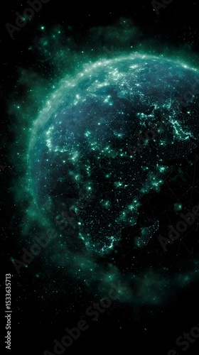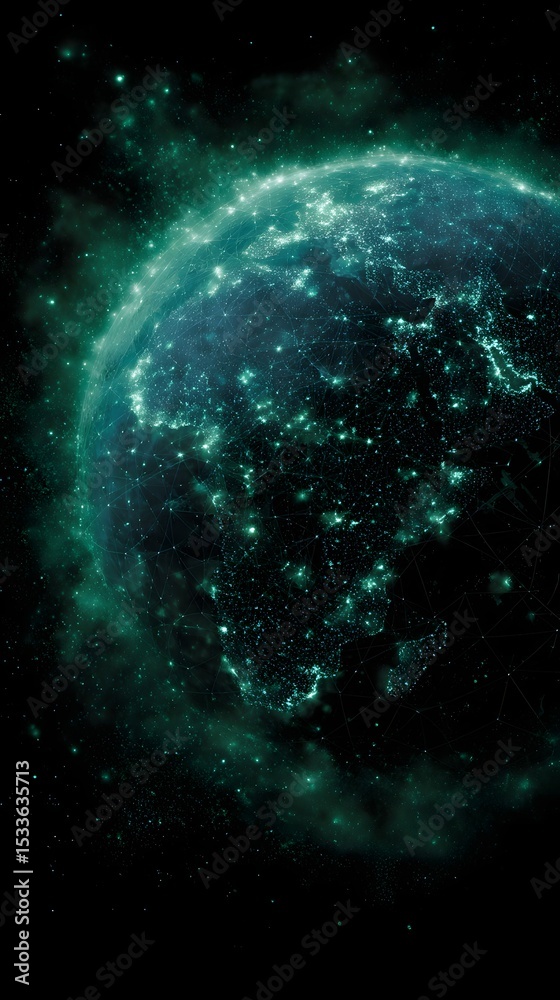 Wall mural glowing green nodes on a cosmic globe represent a distributed solar network - Wall murals Wall mural glowing green nodes on a cosmic globe represent a distributed solar network - Wall murals