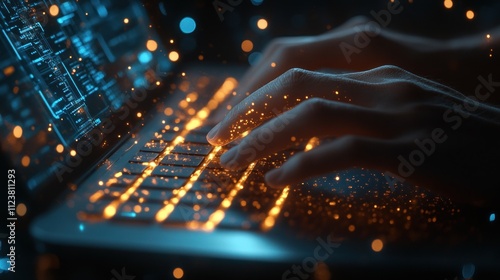 Glowing hands typing on laptop keyboard, digital data streams - Wall mural