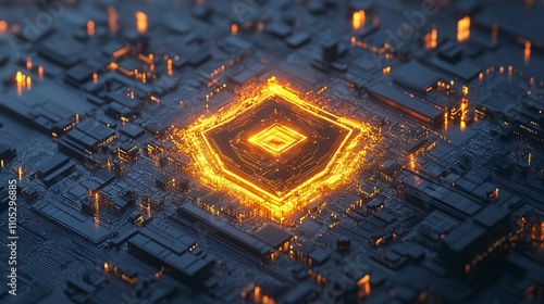 Wall mural glowing hexagon cpu on circuit board.