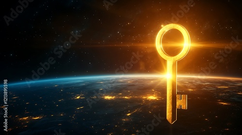 Wall mural : Glowing horizon with a gigantic keyhole and a golden key floating symbolizing the unlocking of unsee