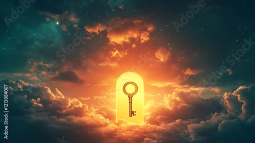 The watermark will not be included on Wall mural.: Glowing horizon with a keyhole in the sky and a floating golden key symbolizing the opening of new w