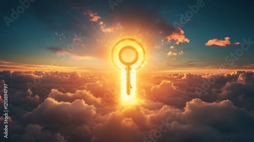 The watermark will not be included on Wall mural.: Glowing keyhole in the sky with a radiant golden key floating nearby symbolizing the unlocking of hi