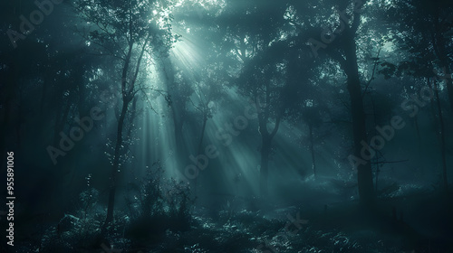 The watermark will not be included on Wall mural.: Glowing light beams breaking through a dense fog in a dark forest