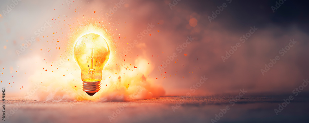 Wall mural glowing lightbulb amidst sparkles and mist on a soft gradient background. - Wall murals Wall mural glowing lightbulb amidst sparkles and mist on a soft gradient background. - Wall murals
