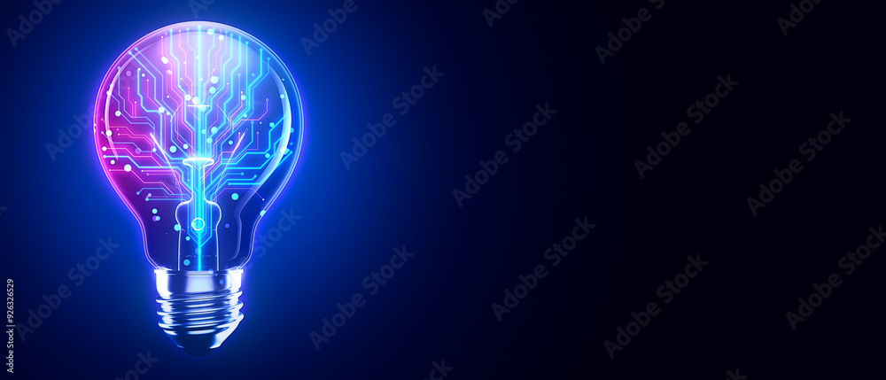 The watermark will not be included on Wall mural.: Glowing lightbulb with circuit design on dark blue background - 3d rendering