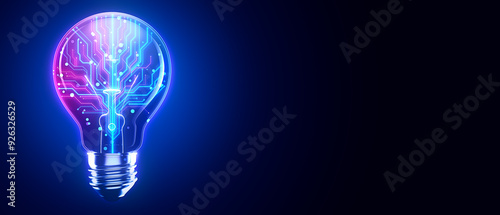 Wall mural glowing lightbulb with circuit design on dark blue background. 3d rendering - Wall murals Wall mural glowing lightbulb with circuit design on dark blue background. 3d rendering - Wall murals