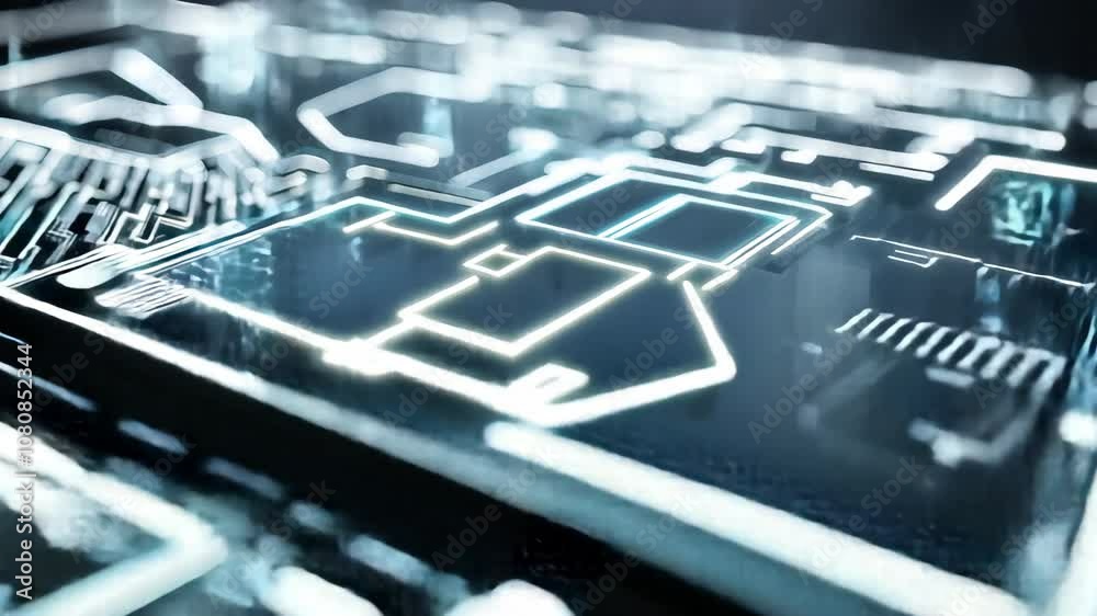 The watermark will not be included on Wall mural.: Glowing microchip sending data through optical fibers with light particles flowing - concept of futur
