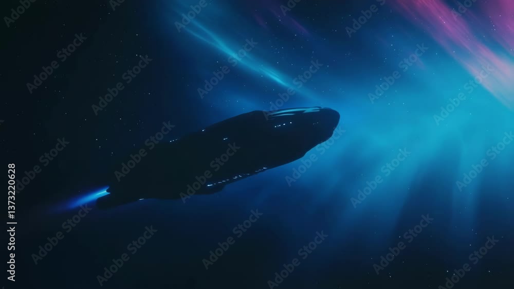 Wall mural glowing nebula clouds provide a backdrop for a futuristic spaceship navigating the cosmos, its engin - Wall murals Wall mural glowing nebula clouds provide a backdrop for a futuristic spaceship navigating the cosmos, its engin - Wall murals