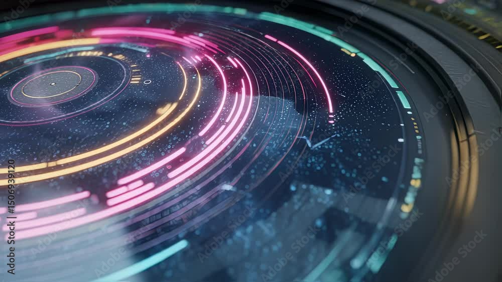 Wall mural : Glowing neon circles and digital data animate a complex control panel, suggesting the activation of