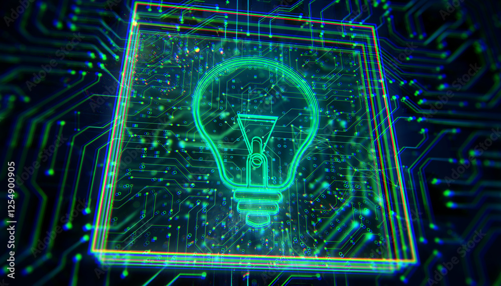 Wall mural glowing neon lightbulb symbol on a futuristic digital circuit board background. 3d rendering
