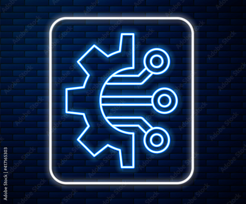 Wall mural glowing neon line algorithm icon isolated on brick wall background. algorithm symbol design from art