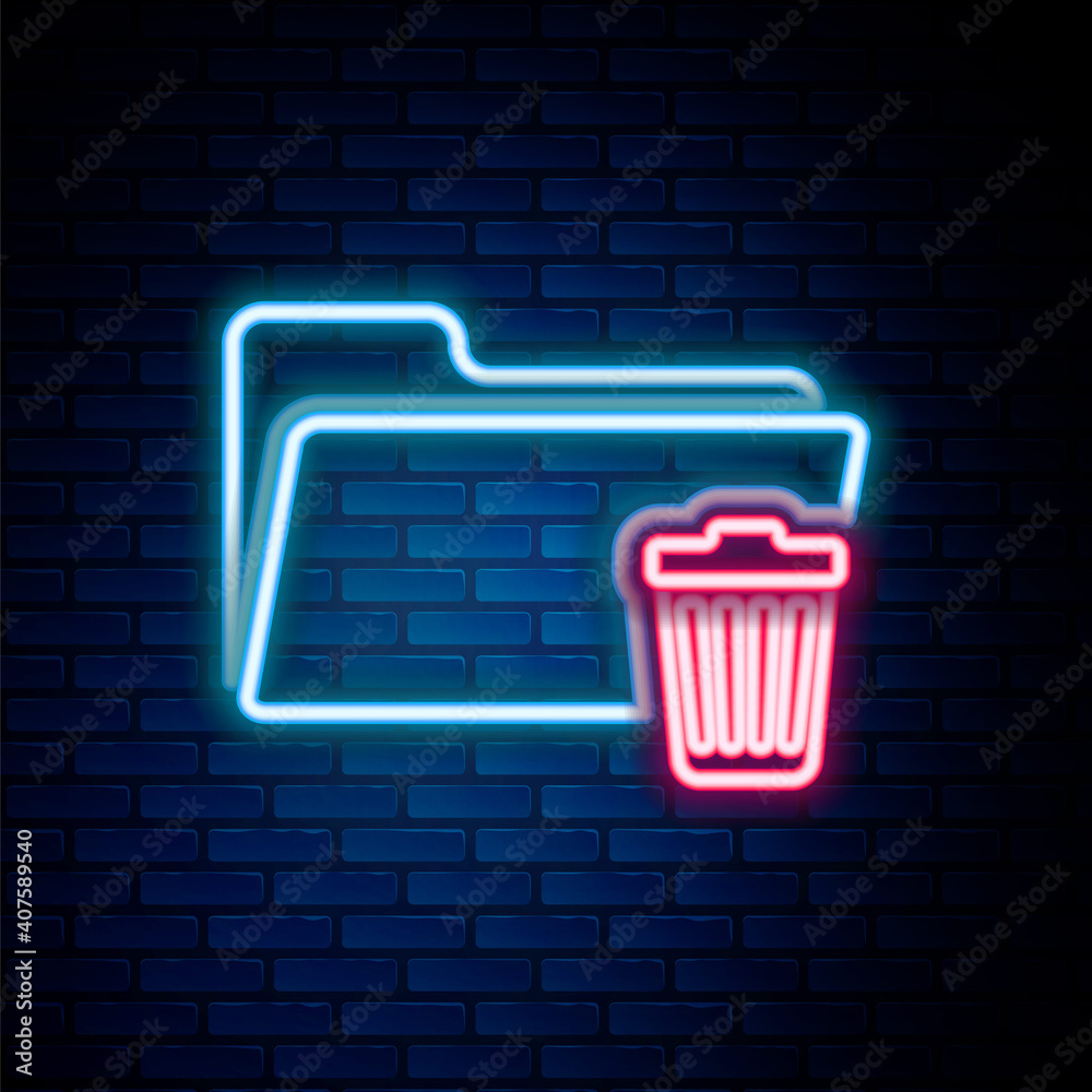Wall mural glowing neon line delete folder icon isolated on brick wall background. folder with recycle bin. del
