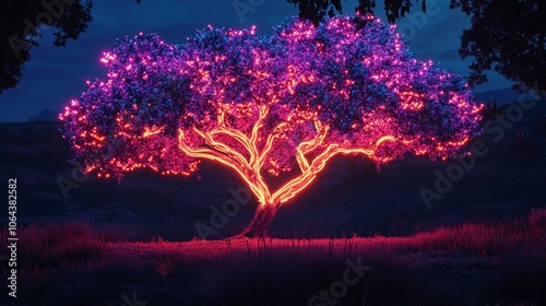 The watermark will not be included on Wall mural.: Glowing neon tree in dark forest landscape with vibrant light effects and illuminated branches, crea