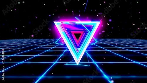 The watermark will not be included on Wall mural.: Glowing neon triangles float over a retro grid in a digital world, creating a vibrant and futuristic