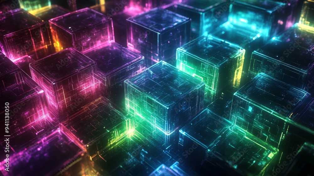 Glowing neon with multicolored lights forming a futuristic square patternWall mural