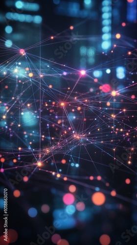 Wall mural : Glowing network of interconnected nodes and lines representing digital connectivity, data transfer,