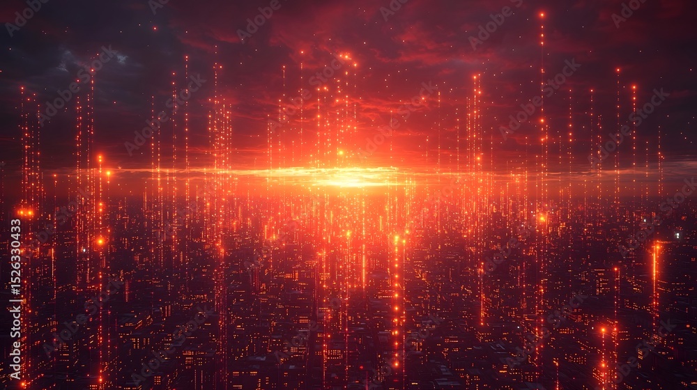 The watermark will not be included on Wall mural.: Glowing neural network visualization of a smart grid cityscape